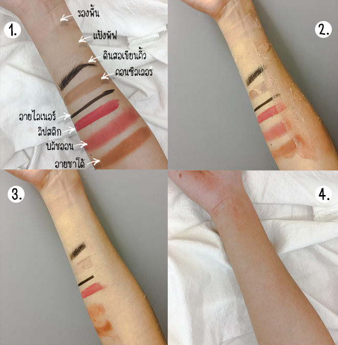 เราลองมาทดสอบประสิทธิภาพในการทำความสะอาดของสบู่กันดูบ้างนะคะ โดยการทดสอบครั้งแรก เฟิร์นขอทดสอบโดยการใช้สบู่ในการชะล้างเครื่องสำอางต่างๆ ที่เราใช้อยู่ในชีวิตประจำวันส่วนใหญ่นะคะ โดยที่เฟิร์นจะลองสวอชเครื่องสำอางต่างๆลงไปบนแขน และลองใช้สบู่ในการล้างออก