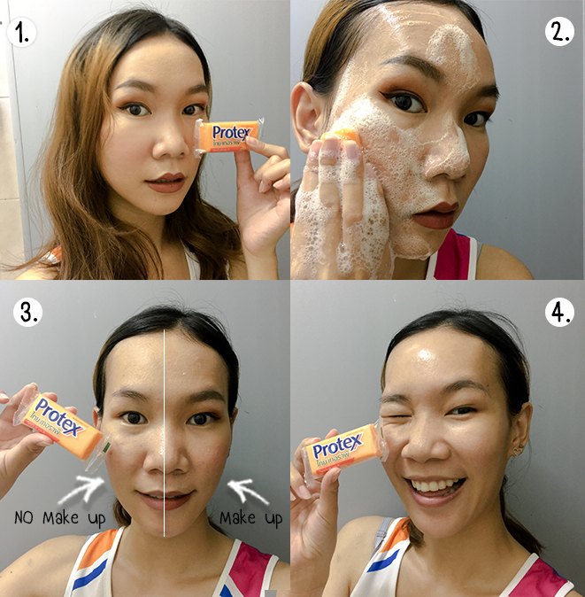 จากภาพด้านบน เฟิร์นทดสอบด้วยการล้างใบหน้าที่ผ่านการแต่งหน้า เพียงครึ่งหน้า จะเห็นถึงความแตกต่างทั้ง2ฝั่งอย่างชัดเจน ฝั่งที่ล้างหน้าด้วยสบู่ Protex จะไม่มีคราบสิ่งสกปรกหรือคราบเมคอัพหลงเหลืออยู่ เค้าสามารถทำความสะอาดได้ทุกเมคอัพ ไม่ว่าจะเป็น อายไลเนอร์,แป้งพัฟ,รองพื้น หรือแม้แต่สกปรกที่อยู่ตามรูขุมขน ได้อย่างหมดจด ช่วยลดขั้นตอนในการทำความสะอาดหน้า ผิวหน้าดูสะอาด กระจ่างใสขึ้นจริงๆค่ะ